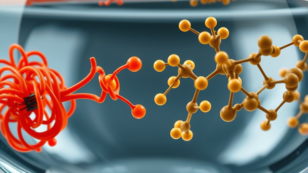 Retinoids stimulate collagen by activating retinoic acid receptors (RARs), which boost gene expression related to cell turnover and collagen production, leading to faster skin renewal. Bakuchiol mimics retinoids’ effects without binding to RARs, promoting collagen through antioxidant and anti-inflammatory pathways more gently. While retinoids can offer quicker results, bakuchiol provides a milder approach suited for sensitive skin. To discover how these molecules work differently and which might suit you best, keep exploring the details below.