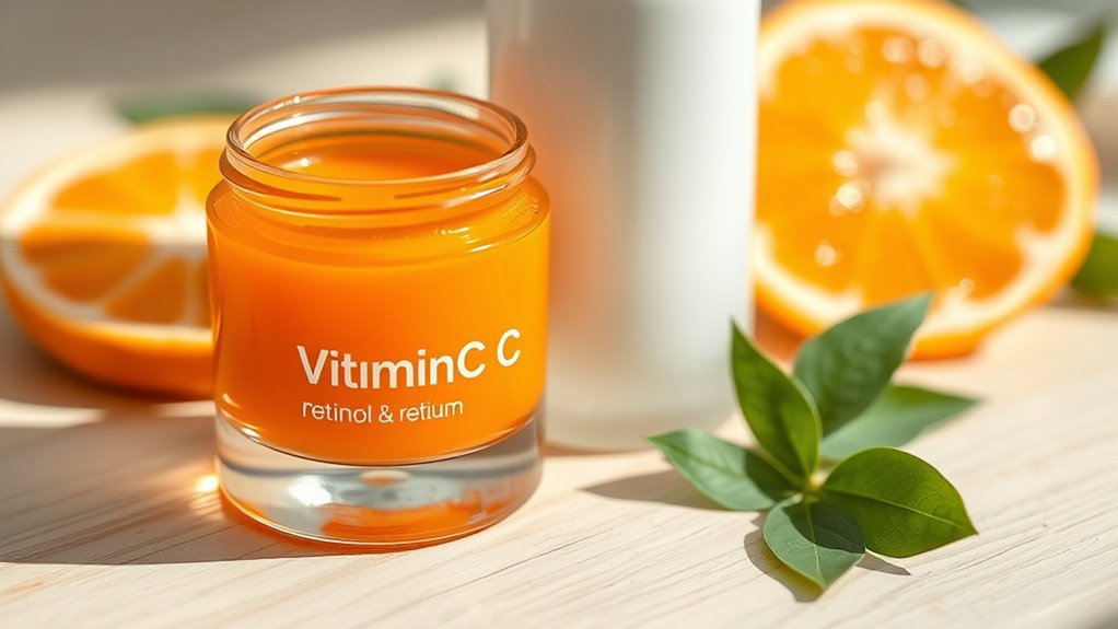 To get the best results with retinol and vitamin C, focus on proper formulation and stability. Retinol needs to penetrate deeper skin layers, so products with encapsulation or liposomes work well, while stabilized vitamin C forms prevent degradation from air and light. Layer correctly—apply water-based formulas first, then oils—and guarantee your products are stored in airtight, opaque containers. Knowing these basics helps maximize their effectiveness, and if you keep exploring, you’ll uncover even more tips.