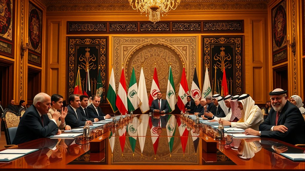Regional powers influence peace negotiations and stability through regional alliances and economic sanctions. You’ll see them backing certain factions, shaping dialogues, and sometimes escalating conflicts to protect their interests. Their alliances can either foster cooperation or deepen divisions, while economic sanctions pressure parties to compromise. By understanding these actions, you grasp how regional powers sway peace efforts, often making negotiations more complex and fragile.