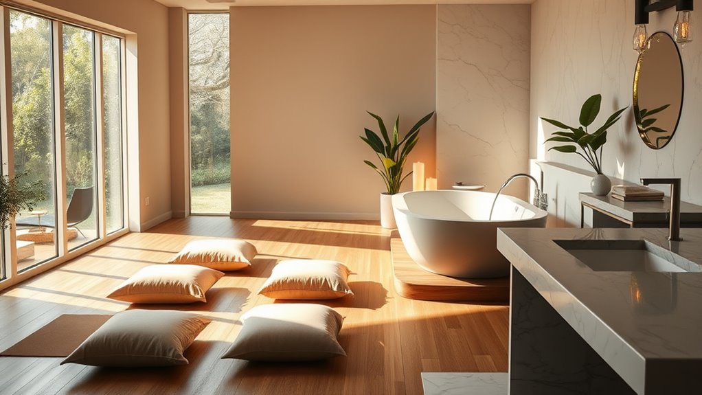 To create soothing meditation rooms and spa bathrooms at home, focus on promoting relaxation through feng shui, natural materials, and calming colors. Position cushions or chairs where natural light flows and keep the space clutter-free. Use essential oils like lavender or eucalyptus to enhance the atmosphere with gentle scent and soft lighting. Incorporate plants, plush textiles, and quiet atmospheres for comfort. Keep exploring ways to transform your space into a personal oasis of calm and renewal.