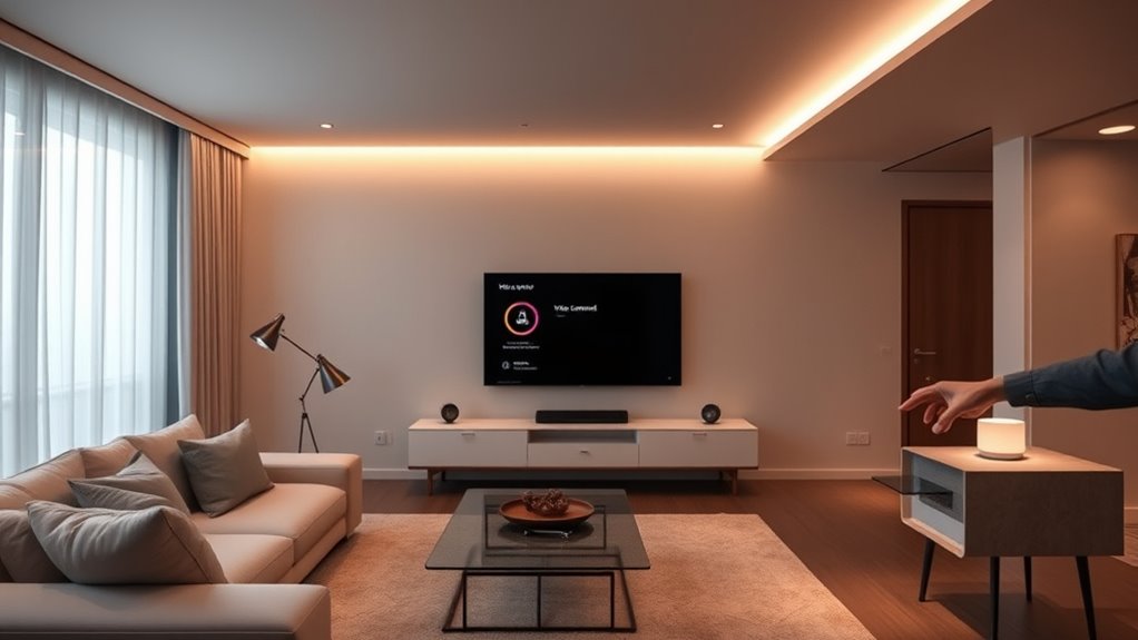 Integrating voice-controlled lighting and furniture makes your smart home more convenient and personalized. With simple voice commands, you can adjust lights, reposition furniture, and automate routines easily. This setup not only saves energy and reduces bills but also enhances security by creating occupancy cues and enabling quick responses to alerts. Your home becomes more comfortable, efficient, and safe. Keep exploring how these smart features can transform your daily life and home environment effortlessly.
