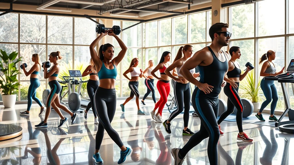 By 2025, you’ll notice virtual workouts becoming even more popular, offering flexibility and variety that fit your busy life. Wearable tech will provide deeper health insights, guiding your fitness journey with personalized feedback. AI-driven coaching and immersive VR experiences will make exercising engaging and motivating. These innovations help you stay consistent and connected, making fitness more accessible and enjoyable. Keep exploring to see how these trends will shape your health and activity habits moving forward.